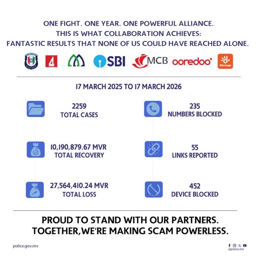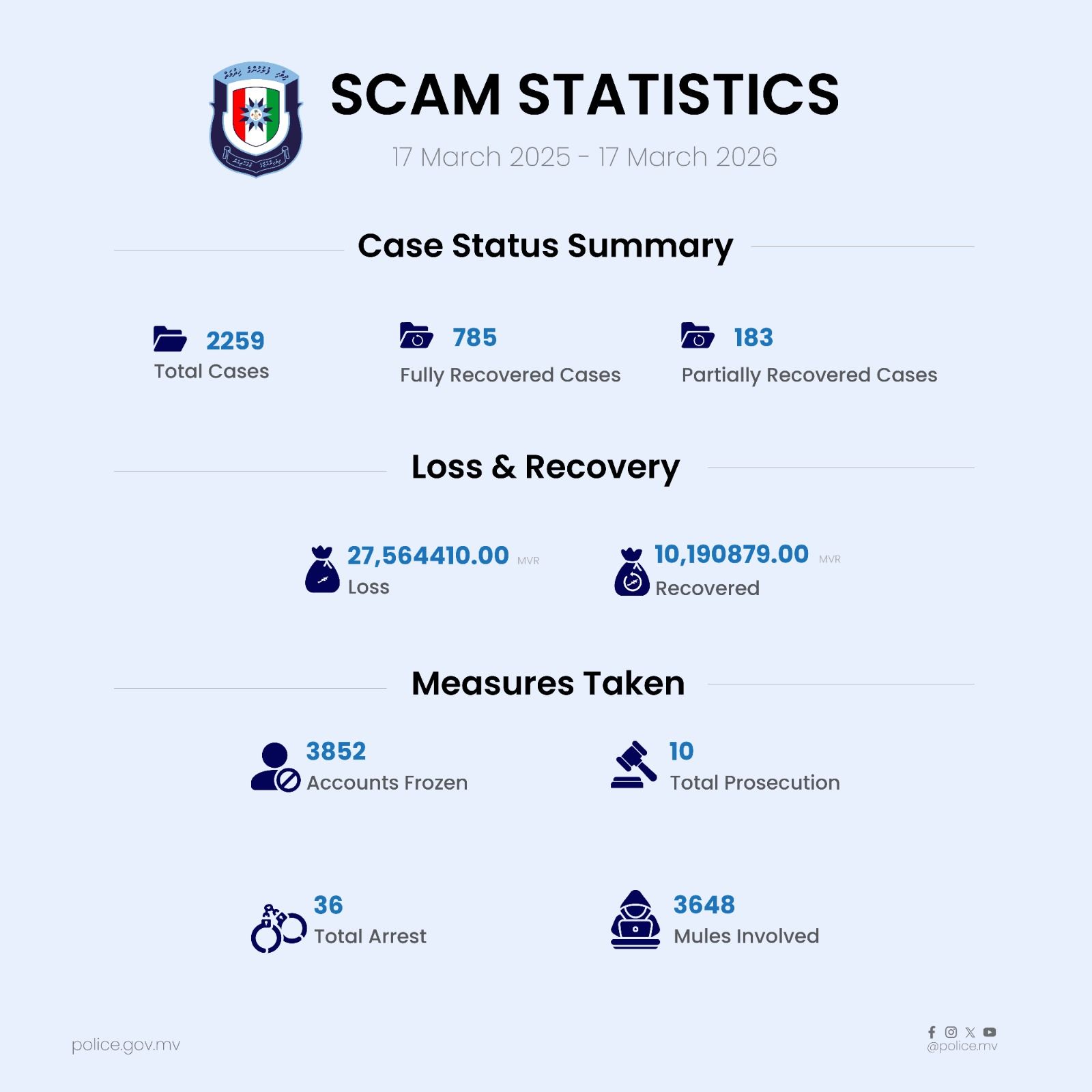 ވޭތުވެދިޔަ އެއް އަހަރުގެ ތެރޭގައި އެންޓި-ސްކޭމް ސެންޓަރަށް 2259 މައްސަލަ ހުށަހެޅިފައިވާކަމަށާއި، އެ މައްސަލަތަކާ ގުޅިގެން 3852 އެކައުންޓް ފްރީޒްކުރިކަމަށް އިންސްޕެކްޓަރ އޮފް ޕޮލިސް އާދަމް ނަވީދު ވިދާޅުވިއެވެ. އަދި ހުށަހެޅުނު މައްސަލަތަކުގައި ހިމެނޭ ޖުމުލަ ފައިސާގެ 40 އިންސައްތަ ފައިސާ އަނބުރާ ވިކްޓިމުންނަށް ހޯދައިދެވުނުކަމަށާއި، އެއީ 785 މައްސަލައެއްގައި ހިމެނޭ ހުރިހާ ފައިސާއާއި 183 މައްސަލައެއްގައި ހިމެނޭ ފައިސާގެ ތެރެއިން ބައެެއްކަމަށް ވިދާޅުވިއެވެ. މީގެ އިތުރުން، ސްކޭމާ ގުޅުންހުރި ކުށްތަކުގެ ތުހުމަތުގައި 36 މީހަކު ފުލުހުންގެ ބެލުމުގެދަށަށް ގެނެސް، އޮޕަރޭޝަންތަކެއް ހިންގާފައިވާކަމަށާ އަދި ދައުވާކޮށްދިނުމަށް އެދި 10 މައްސަލައެއް ޕްރޮސިކިއުޓަރ ޖެނެރަލްގެ އޮފީހަށް ފޮނުވާފައިވާނޭކަމަށް ވެސް ވިދާޅުވިއެވެ.